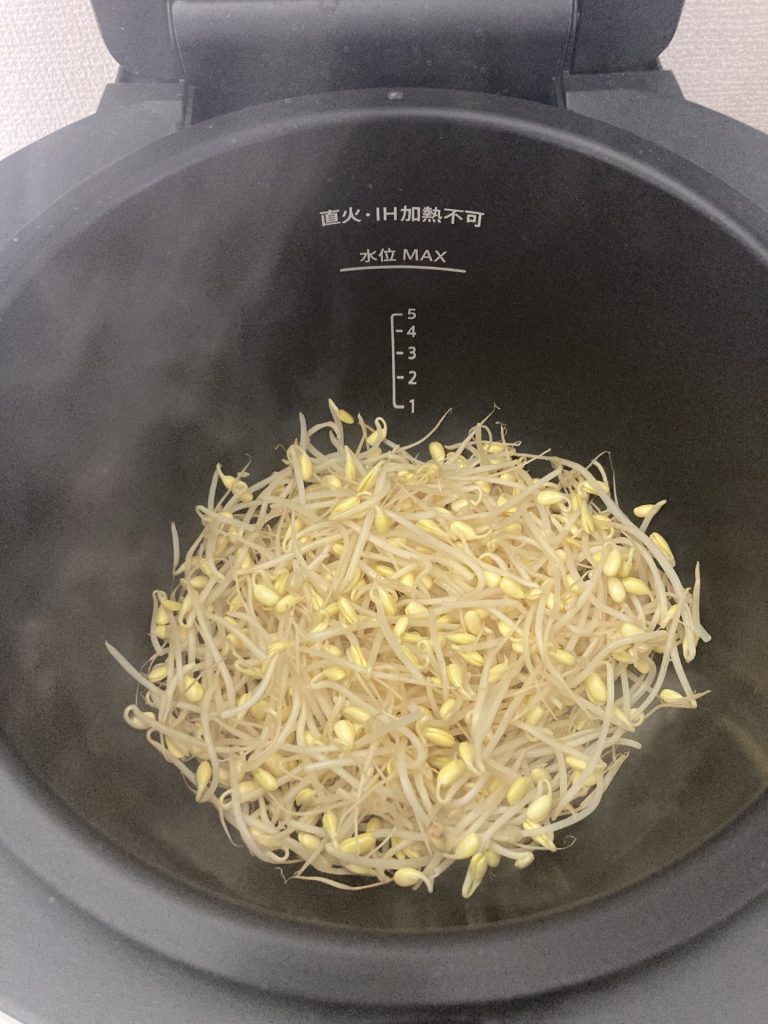もやし1袋を鍋にいれて『無水で茹でる』を3分