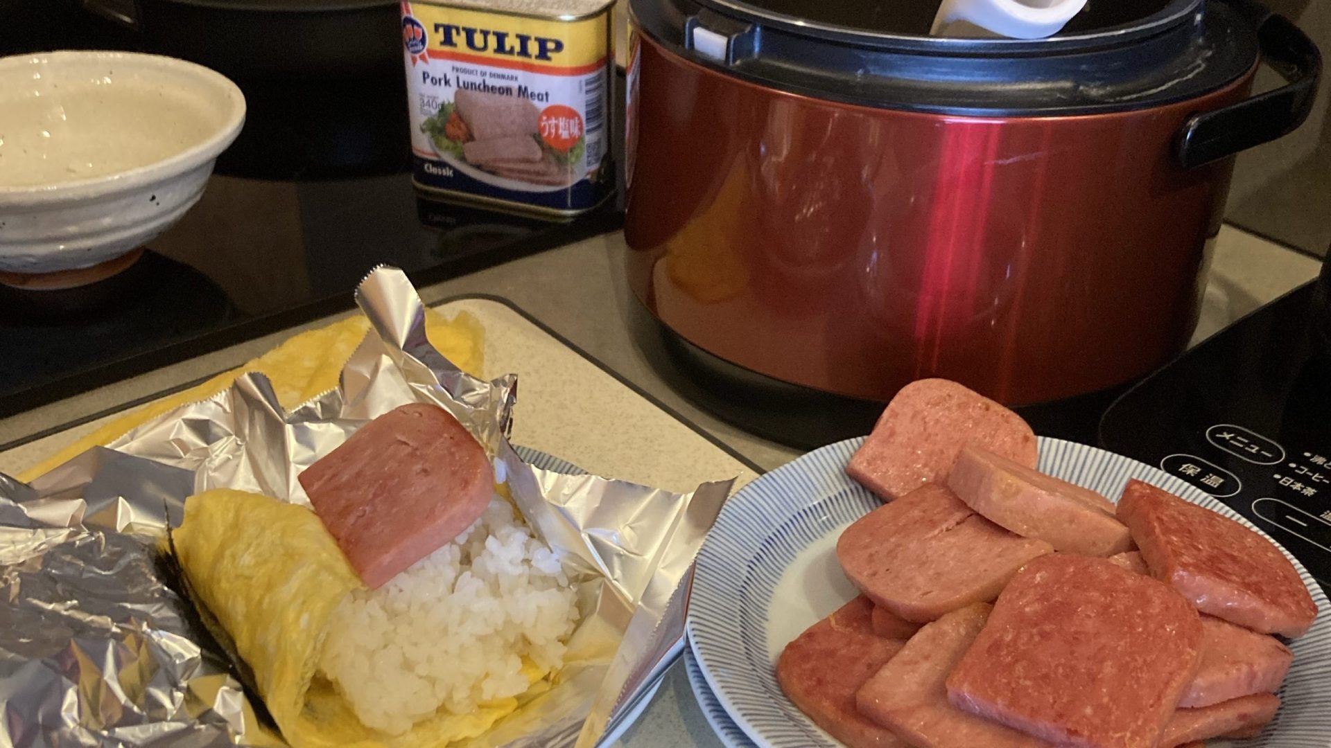 朝食はついてませんので、食材を調達してランチョンミートおにぎりを作りました!